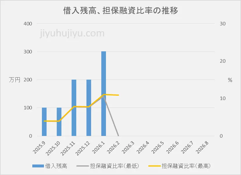 冒頭でも書きましたが、今月は途中で証券担保ローンを全返済しています。そのため借入残高は0円、担保融資比率の最低値は0%になっています。